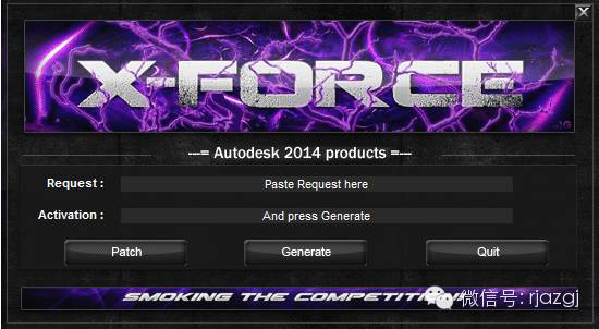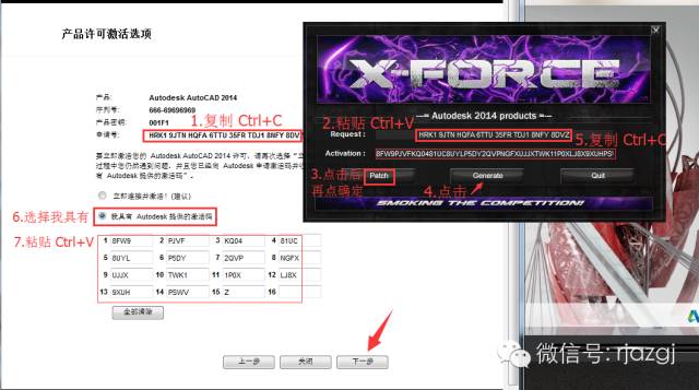 13.把申请号复制到注册机里面的Request中(记得删除原Request中的内容),先点击Patch,再点击Generate后复制Activeation中生成的激活码,然后粘贴激活码至我具有Autodesk提供的激活码方框中。最后点击下一步即可。