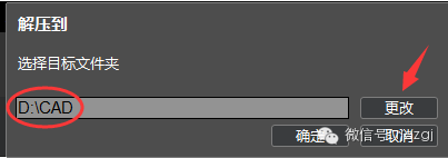 3.点击更改,选择解压目标文件夹,可在D盘或其它盘里面新建一个CAD文件夹,然后点击确定(大概需要3分钟左右)。